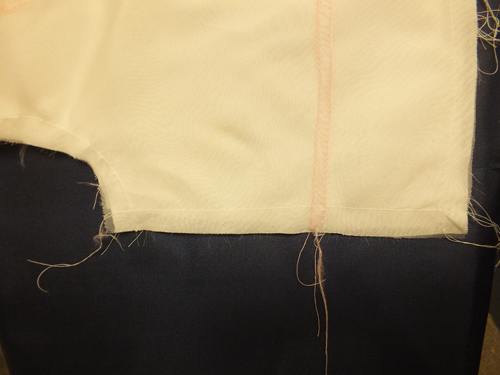 Instead I suggest finishing with a bias strip from the batiste. Cut the strip 1-3/4 inches wide. Fold it in half and press in a circle shape echoing the shape of the your neckline. With the raw edges of the bias aligned with the raw edges of the jacket and working on the right side of the jacket, sew around the neckline with a 1/4-inch seam. Trim the ends of the bias so they overlap the turned-back facing approximately 1 inch. Clip the curves, turn the bias binding to the wrong side, turn the facings to the inside of the jacket (this will also flip the bottom hem up as well) and press around the neck, the hem and down the facings. The bottom hem should meet or be positioned slightly beyond the bottom shadow stitching.